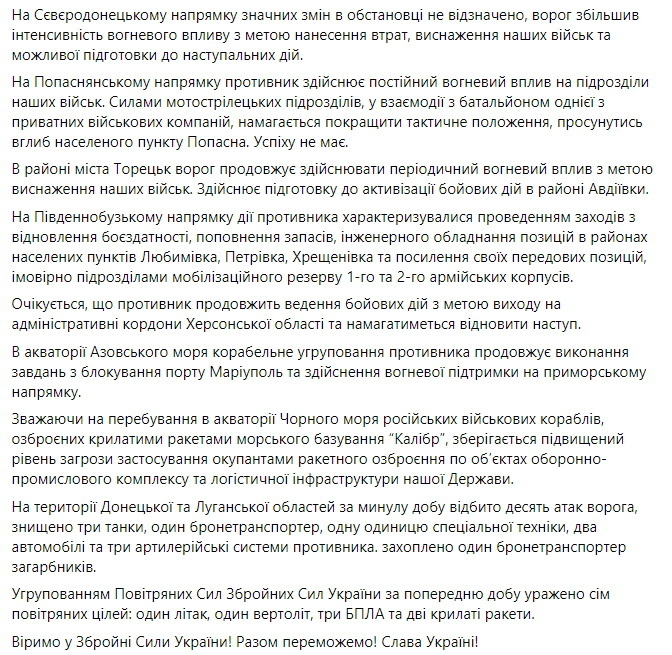 Зведення Генштабу: Основні зусилля росіян – на утриманні зайнятих позицій та рубежів. Для посилення угруповання на зазначеному напрямку відзначається розгортання додаткових підрозділів зі складу 35 загальновійськової армії. Не виключено, що ворог активізується у напрямку Ізюма та Барвінкового для виходу до тилу підрозділів Об'єднаних сил у районі Слов'янська.