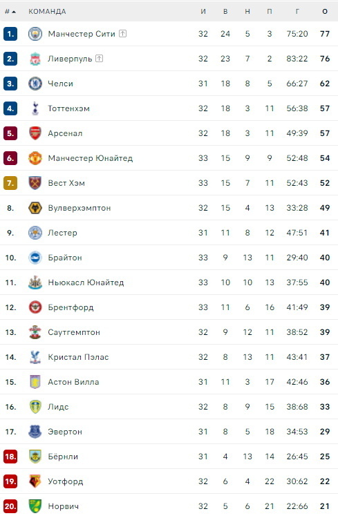 Лідери АПЛ: Ман Сіті (77), Ліверпуль (76), Челсі (62), Арсенал, Тоттенхем (57), Ман Юнайтед (54), Вест Хем (52).