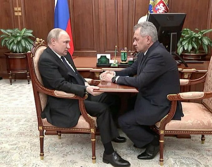 Больной путин вцепился в стол на встрече с шойгу также крепко, как в президентское кресло. Тем временем все активно обсуждают его неестественную позу на сегодняшних переговорах, а также подозрительно опухшие руки, которые были замечены на одном из его предыдущих обращений. pic.twitter.com/RfDhVuumuT