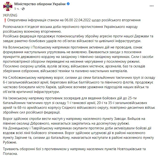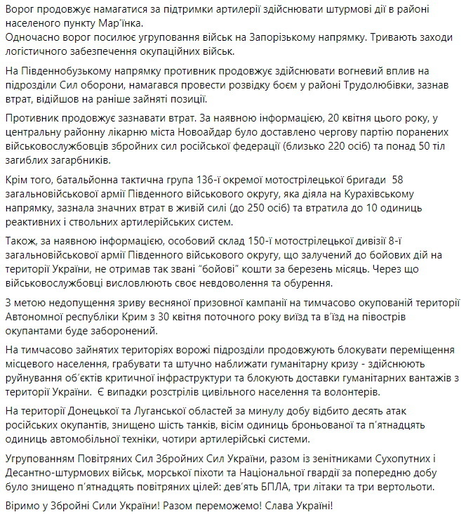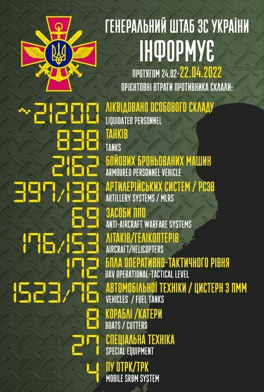 Дані Генштабу ЗСУ: Загальні бойові втрати противника з 24.02 по 22.04 орієнтовно склали:
