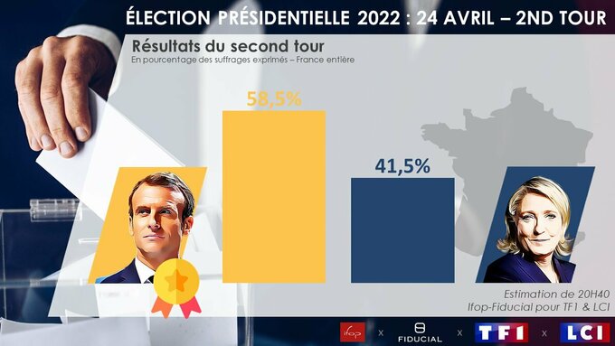 Таким чином, розрив між кандидатами став дещо меншим, ніж у 2017 році, коли за Макрона віддало голоси 66,1% виборців, а за Ле Пен – 33,9%.