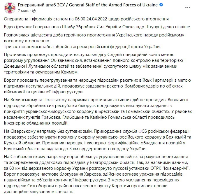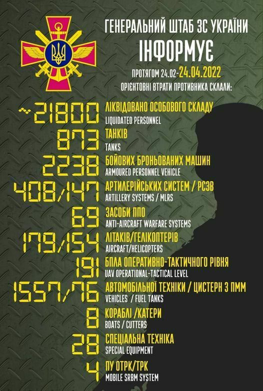 Звіт Генштабу: Загальні бойові втрати противника з 24.02 по 24.04 орієнтовно:
