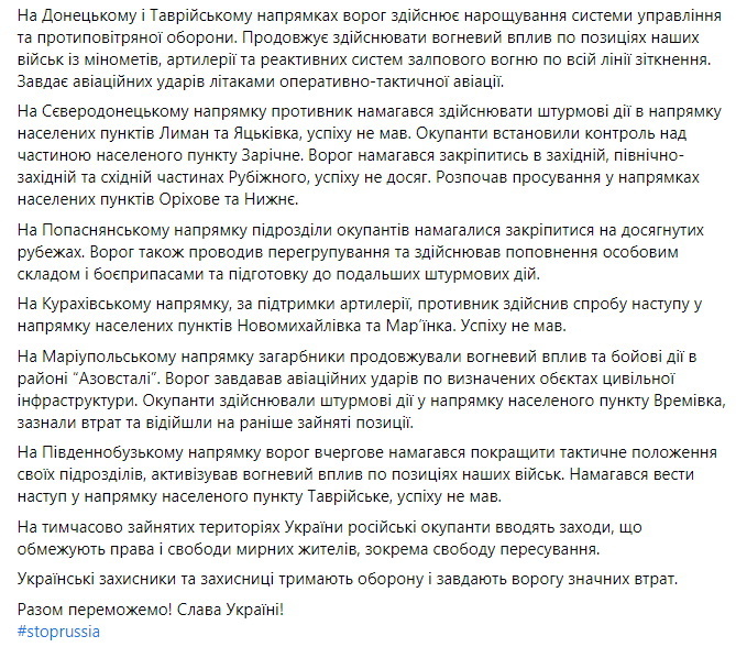«Незважаючи на те, що росія змогла дещо просунутися, українська армія чинила рішучий опір на всіх напрямках і завдала значних втрат російським силам. На ефективність російських підрозділів, ймовірно, впливає їх низький моральний дух і обмежений час на відновлення боєздатності та реорганізацію сил після попередніх наступальних операцій».