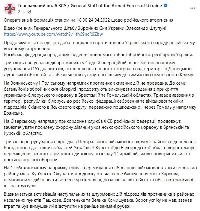 Зведення Генштабу ЗСУ: Відзначається активізація наступальних та штурмових дій підрозділів противника в районах населених пунктів Пашкове, Довгеньке та Велика Комишуваха (Харківська область). Ворог успіху не мав, зазнав втрат і був змушений відступити на раніше зайняті рубежі.