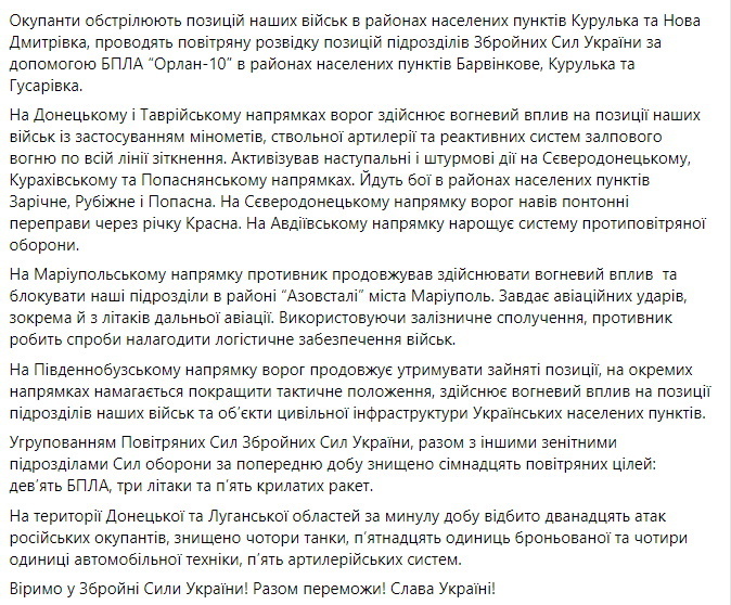 Військово-транспортна, винищувальна, бомбардувальна, штурмова авіація Повітряних сил продовжує виконання завдань у повітряному просторі України, підтримує та прикриває наземні війська, завдає вогневих поразок за позиціями російських окупаційних військ. А протиповітряна оборона держави продовжує знищувати ворога у повітрі».