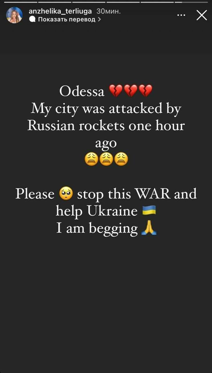 «Одеса… Моє місто знову атаковане ракетними ударами годину тому. Будь ласка, зупиніть війну та допоможіть Україні. Я вас благаю», - написала Терлюга.