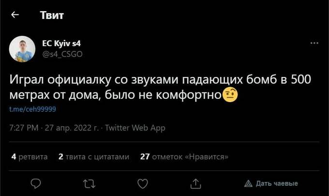 «Грав офіціалку зі звуками падаючих бомб за 500 метрів від будинку. Було некомфортно», – написав s4.