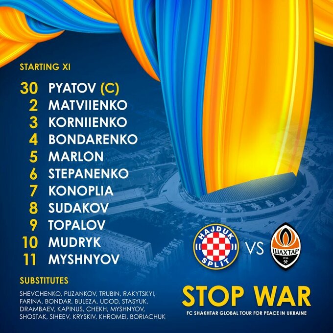 Склад «Шахтаря» на благодійний матч з «Хайдуком»: Пятов, Конопля, Марлон, Матвієнко, Корнієнко, Бондаренко, Степаненко, Топалов, Судаков, Мудрик, Соломон.