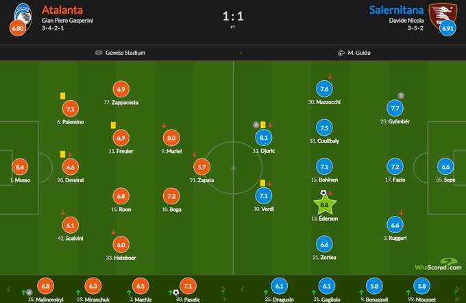 Маліновський вийшов на поле на 75 хвилині. За цю гру українець здобув 6.8 бала. Найкращим гравцем матчу став хавбек «Салернітани» Едерсон - 8.8. У «Аталанти» найвищий бал отримав воротар Муссо (8.4).