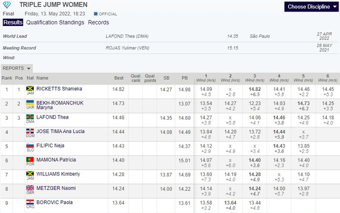 У секторі для потрійних стрибків українка показала результат 14.73 м. Це перший успіх Бех-Романчук на змаганнях просто неба цього сезону.