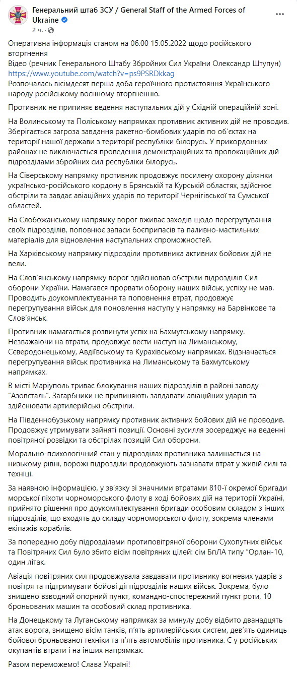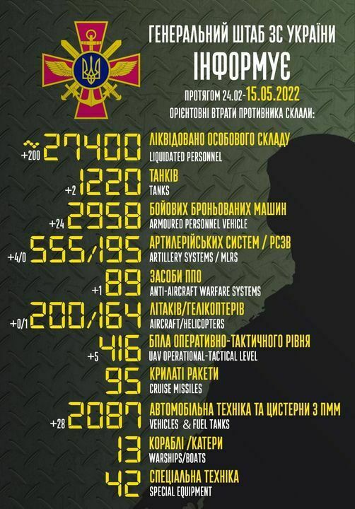 Дані Генштабу ЗСУ. Загальні бойові втрати противника з 24.02 до 15.05 орієнтовно склали:
