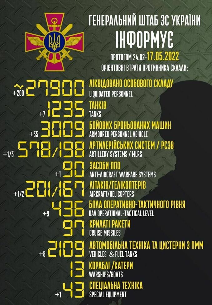 Пропонуємо до вашої уваги зведення загальних бойових втрат росії з 24.02 по 17.05.