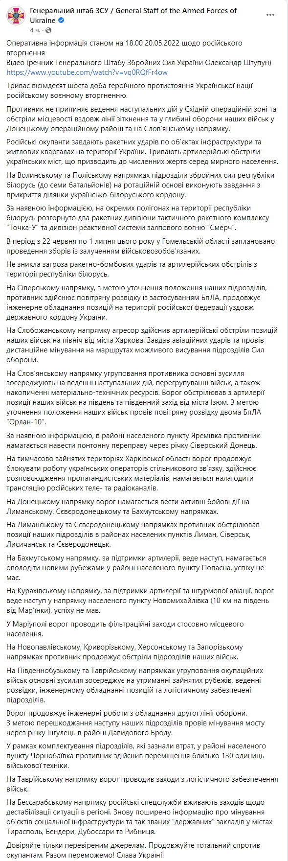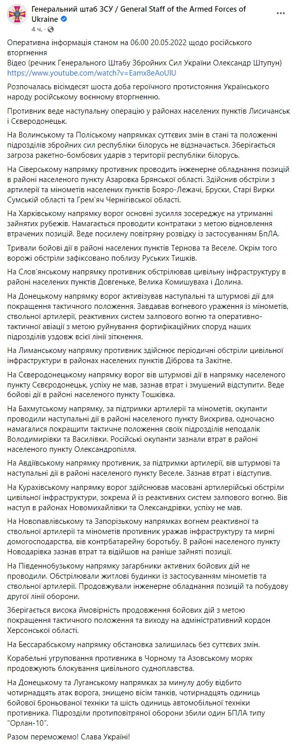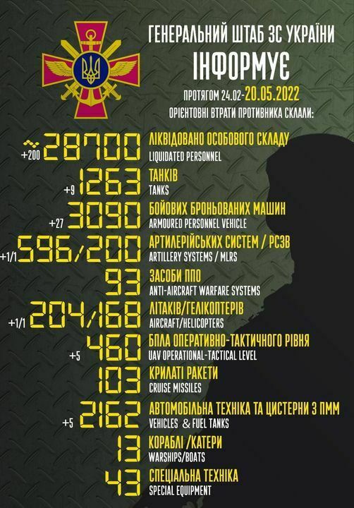 Генеральний штаб ЗСУ: Загальні бойові втрати противника з 24.02 до 20.05 орієнтовно склали: