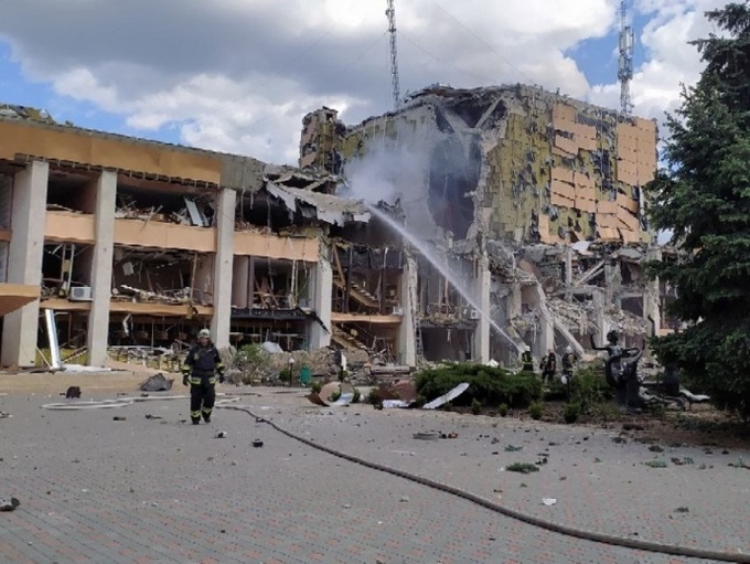 В управлінні Державної служби з надзвичайних ситуацій Харківської області повідомили, що рятувальники на місці гасять пожежу та розбирають завали. російські окупанти завдали удару по будівлі близько 15:00.