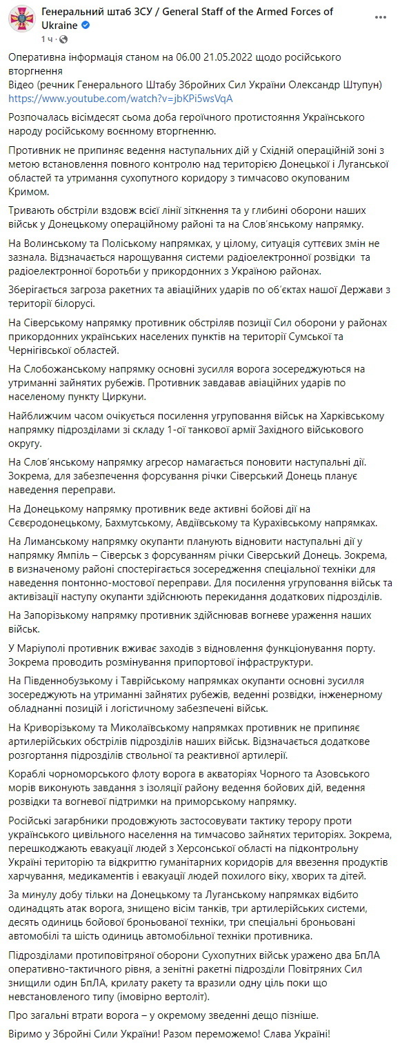 Дані Генштабу: Загальні бойові втрати противника з 24.02 до 21.05 орієнтовно склали: