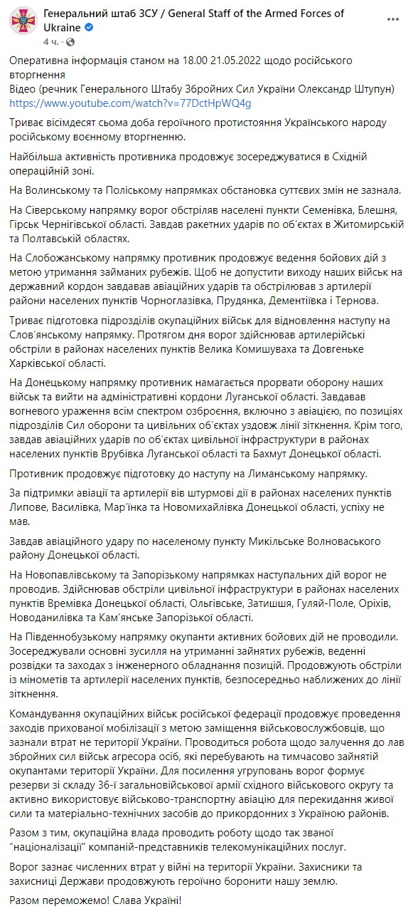 Генштаб ЗСУ: «Противник не припиняє ведення наступальних дій у Східній операційній зоні з метою встановлення повного контролю над територією Донецької та Луганської областей та утримання сухопутного коридору з тимчасово окупованим Кримом».