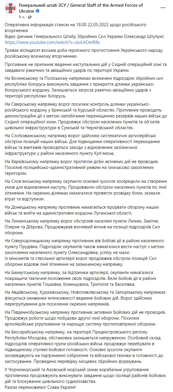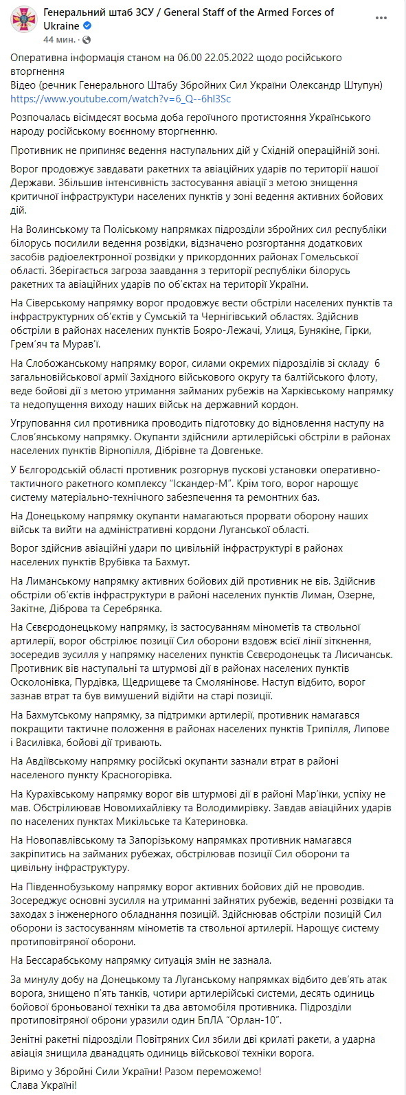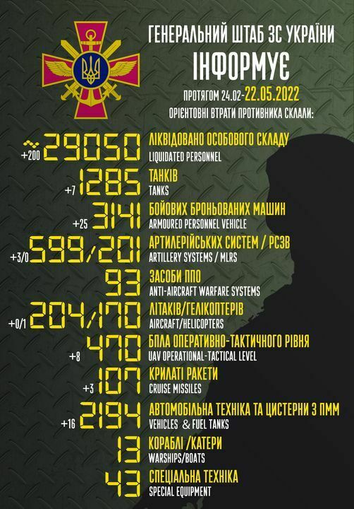 Генеральний штаб ЗСУ: загальні бойові втрати противника з 24.02 до 22.05 орієнтовно склали: