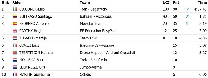 Італійський велогонщик команди «Trek Segafredo» Джуліо Чікконе став переможцем 15-го етапу Джиро д’Італія-2022. У боротьбі з відриву він випередив Сантьяго Буітраго та Антоніо Педреро.
