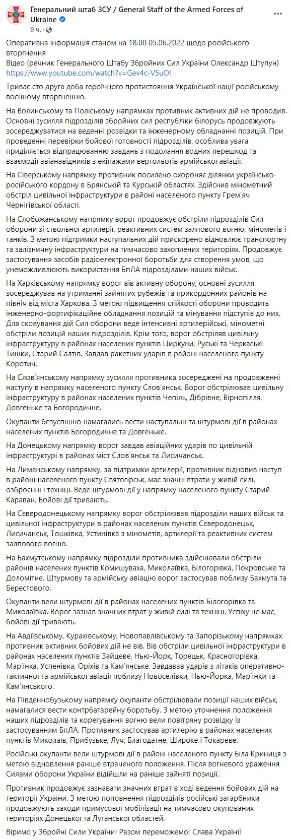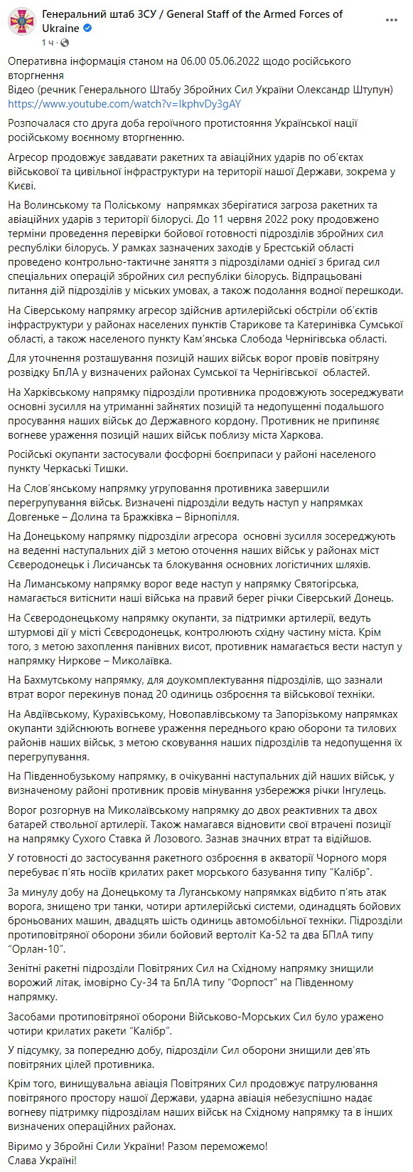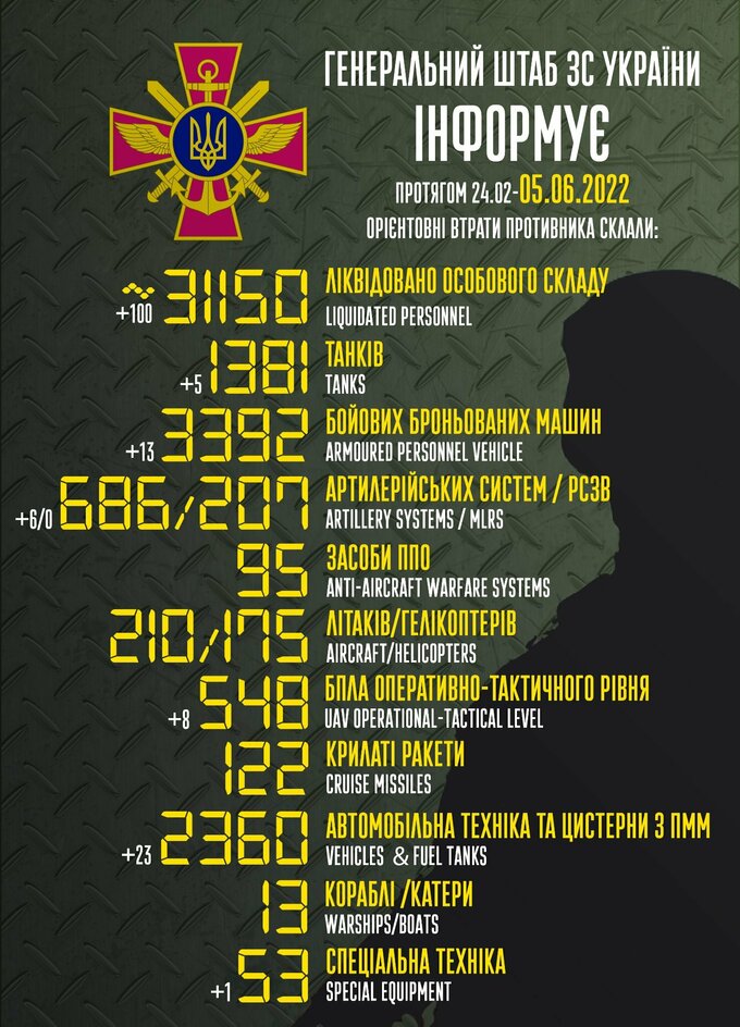 За даними Генштабу ЗСУ, найбільших втрат противник зазнав на Бахмутському напрямку. Загальні бойові втрати противника з 24 лютого до 5 червня орієнтовно склали: