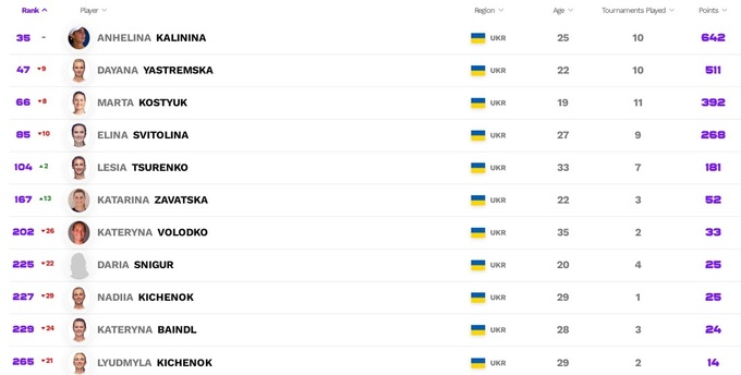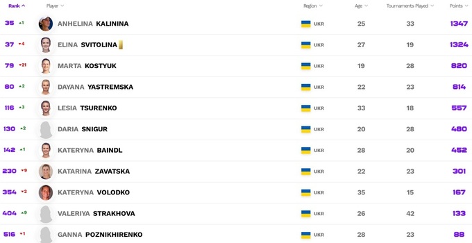 Ангеліна Калініна не просто встановила особисте досягнення, а ще й дебютувала у статусі першої ракетки України. Багато втратила Марта Костюк, тепер вона разом із Даяною Ястремською перебуває наприкінці восьмого десятка. Кілька рядків додали Леся Цуренко, Дар'я Снігур та Катерина Байндл. Катаріна Завацька продовжує втрачати позиції.