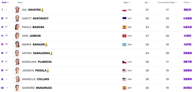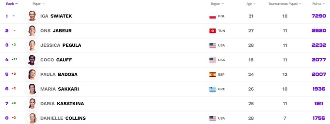 У Чемпіонській гонці Свьонтек набрала вже майже втричі більше очок, ніж найближча з переслідувачок. Пегула піднялася в трійку найкращих, Гауфф увірвалася з третього десятка одразу на четверте місце.