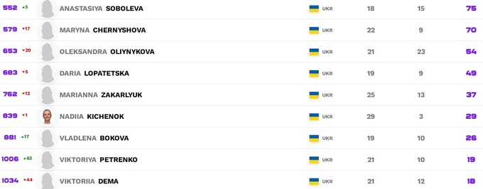 Калініна втрималася на своїй позиції, решта здебільшого втратила, трохи підтягнулися Катаріна Завацька та Леся Цуренко.