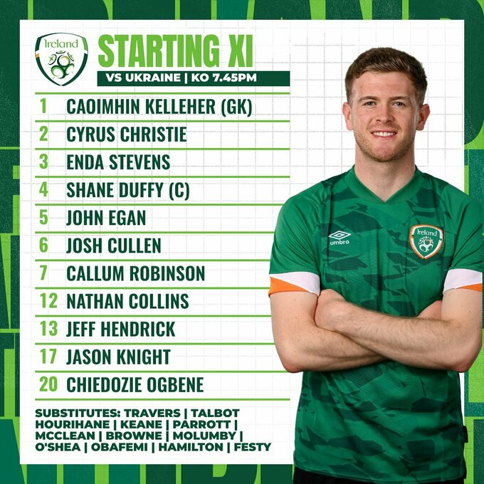 Ірландія: Келлегер – Еган (О’Ши, 62), Даффі, Коллінз – Стівенс (Макклін, 68), Каллен, Гендрік, Крісті (Браун, 68) – Найт, Огбене (Гемілтон, 78), Робінсон (Обафемі, 68).