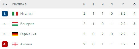 У групі попереду Італія (4) та Угорщина (3). Німеччина має 2 очки після двох турів, в Англії поки що лише 1 пункт.