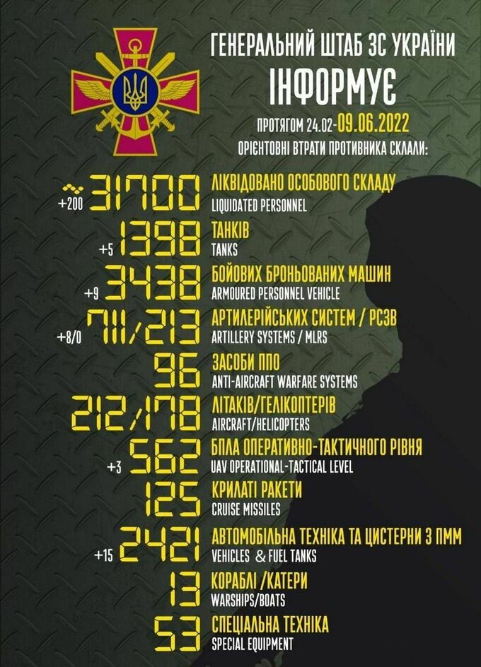 Пропонуємо до вашої уваги зведення загальних бойових втрат росії з 24.02 по 09.06.