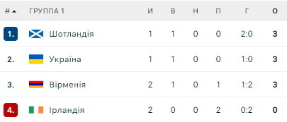 Після двох турів у групі по 3 очки набрали Україна, Шотландія, Вірменія, а от Ірландія залікових балів не має. Проте одну гру 1-го туру між Шотландією та Україною перенесено на вересень.