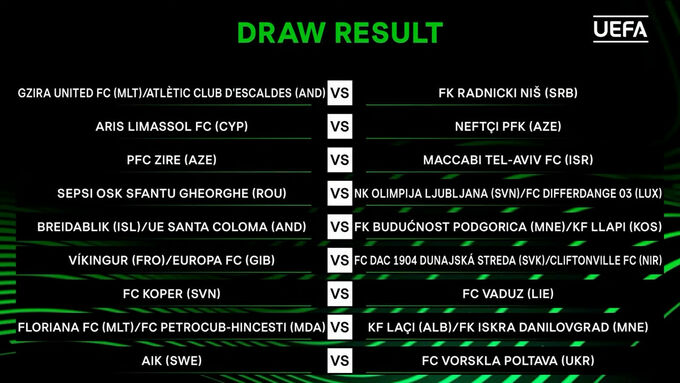 - Брейдаблік (Ісландія) / СО Санта-Колома (Андорра) – Будучност (Чорногорія) / Лапі (Косово)