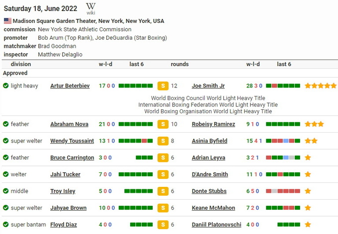 Поєдинок за титули чемпіона світу за версіями WBC, WBO та IBF у напівважкій вазі між Артуром Бетербієвим (17–0, 17 КО) та Джо Смітом (28–3, 22 KO) відбудеться ввечері 18 червня у Madison Square Garden в Нью-Йорку.