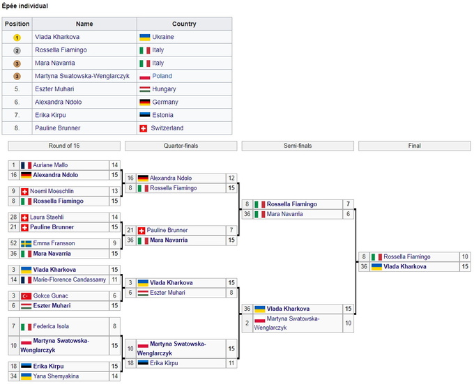 Першу нагороду Україні, одразу золоту, принесла шпажистка Влада Харькова. У фіналі вона перемогла італійку Росселлу Ф'ямінго (15:10) та виграла свою першу медаль на дорослому рівні.