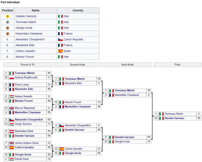 Найкращим серед українців став Ростислав Герцик. У 1/16 фіналу він програв із різницею в один укол австрійцю Максиміліану Еттельту (14:15). Андрій Погребняк на цій же стадії не впорався із поляком Анджеєм Жадковськи (8:15). Данило Гойда у 1/32 фіналу програв теж Жадковськи (13:15). А Клод Юнес у 1/32 не впорався з грузином Павлом Боронтовим (8:15).