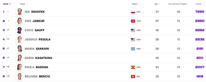 У Чемпіонській гонці Корі Гауфф обійшла Джессіку Пегулу і стала третьою, а Белінда Бенчич опинилася у першій вісімці. Іга Свьонтек продовжує лідирувати з божевільним відривом.