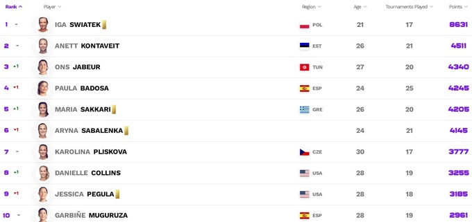 У першій десятці відбулося ще кілька невеликих змін. Корі Гауфф піднялася на 12-й рядок, оновивши особисте досягнення.