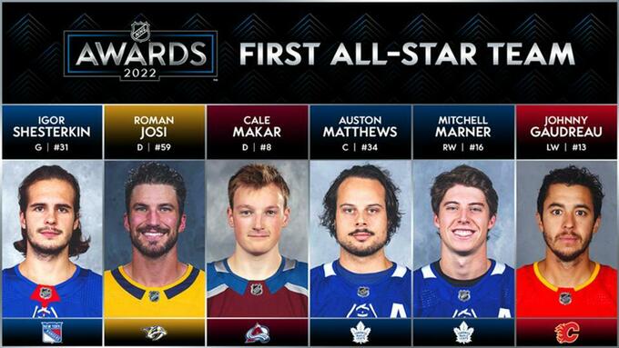 Ігор Шестеркін (Рейнджерс) – Кейл Макар (Колорадо), Роман Йосі (Нешвілл) – Джонні Гудро (Калгарі), Мітч Марнер (Торонто), Остон Меттьюз (Торонто).