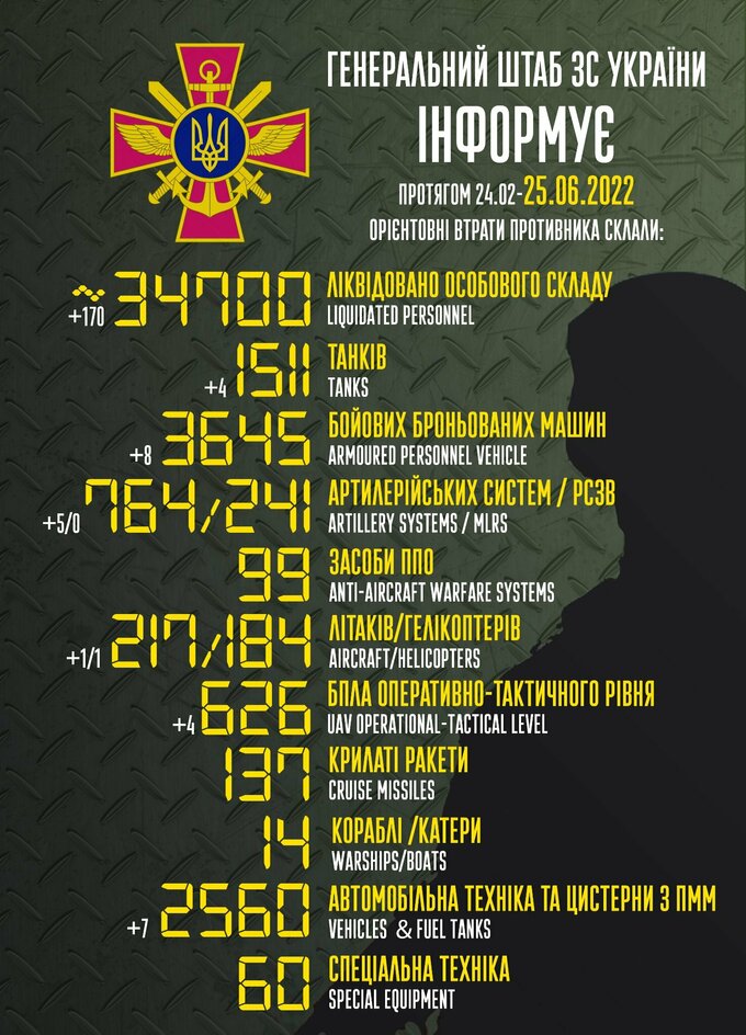 Пропонуємо до вашої уваги зведення загальних бойових втрат росії з 24.02 по 25.06.