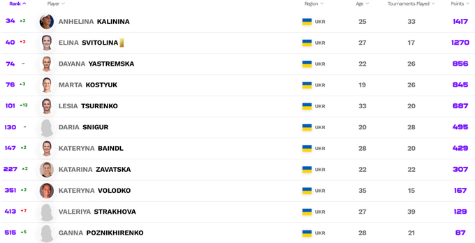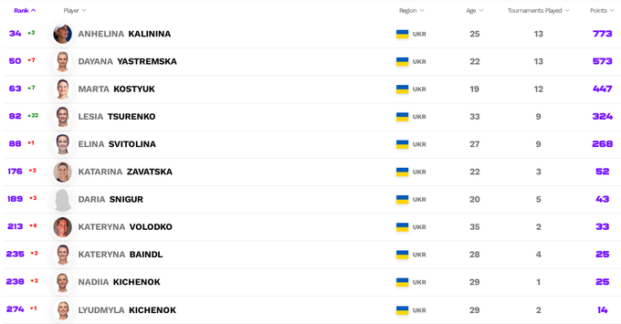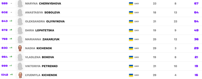 Українки непогано виступили минулого тижня та покращили свої позиції. Ангеліна оновила особисте досягнення, Леся Цуренко впритул наблизилася до першої сотні, а Костюк, Байндл, Завацька та Володько додали кілька рядків.