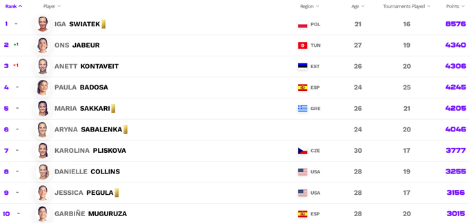 У першій десятці відбулася одна зміна - Онс Жабер помінялася місцями з Анетт Контавейт. Наразі 27-річна туніска друга ракетка світу. Хто б міг про це подумати ще два роки тому.