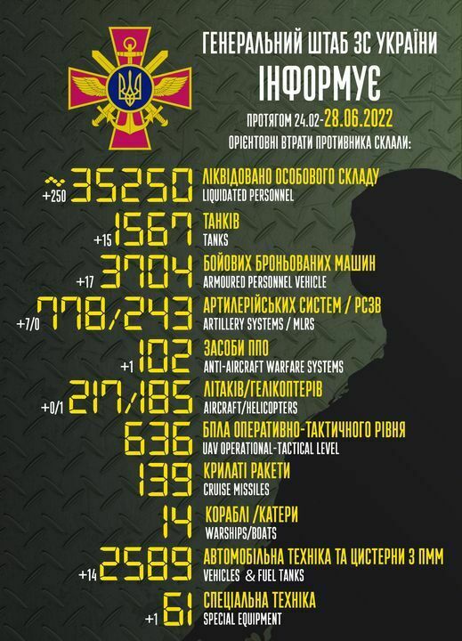 Генеральний штаб ЗСУ: Загальні бойові втрати противника з 24.02 до 28.06 орієнтовно склали: