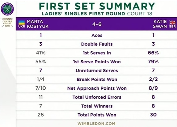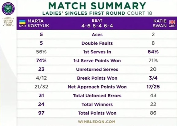 Марта Костюк (Україна) – Кеті Свон (Велика Британія) – 4:6, 6:4, 6:4