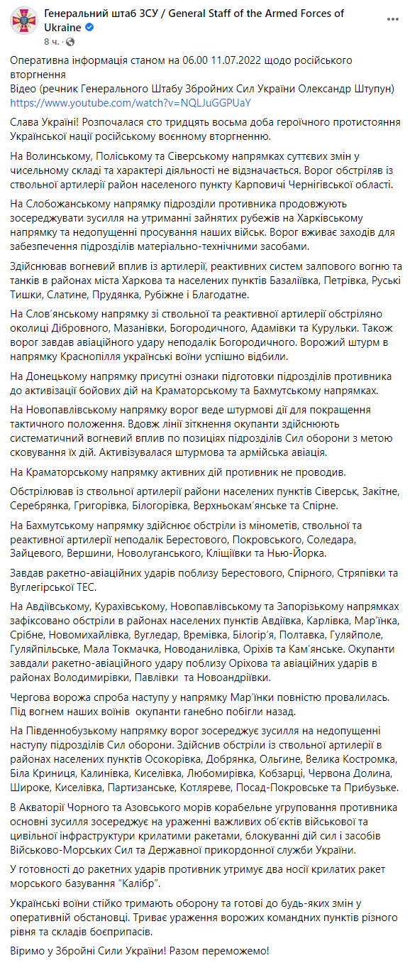 Генштаб ЗСУ: Найбільших втрат ворог зазнав на Авдіївському напрямку. Загальні бойові втрати загарбників противника з 24.02 до 11.07 орієнтовно склали: