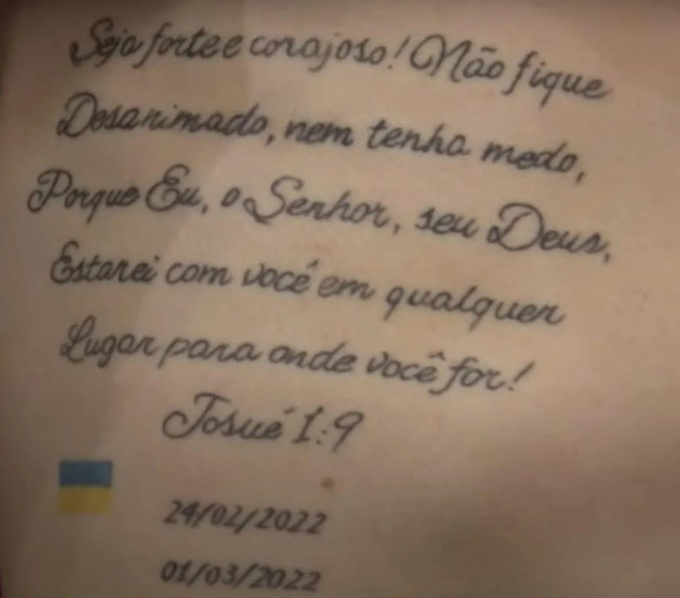 «Я зробив це тату, коли повернувся з України до Бразилії. Це фраза з Біблії. «Не бійся і не зневіряйся, бо Господь, твій Бог, з тобою, куди б ти не пішов».