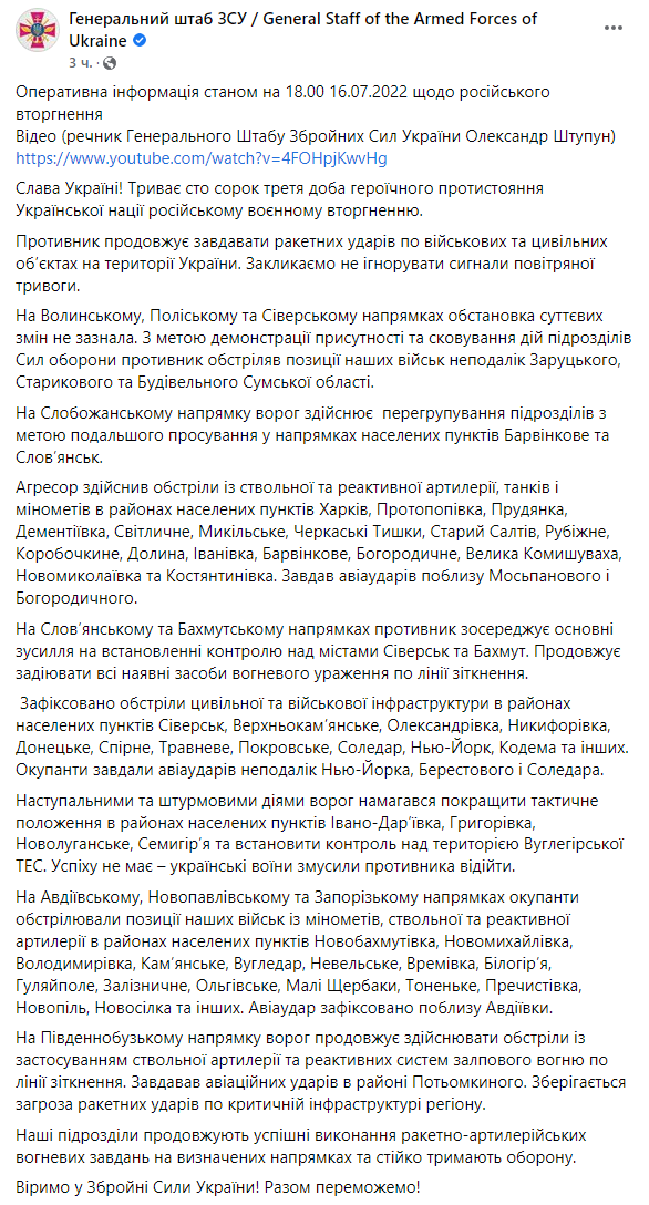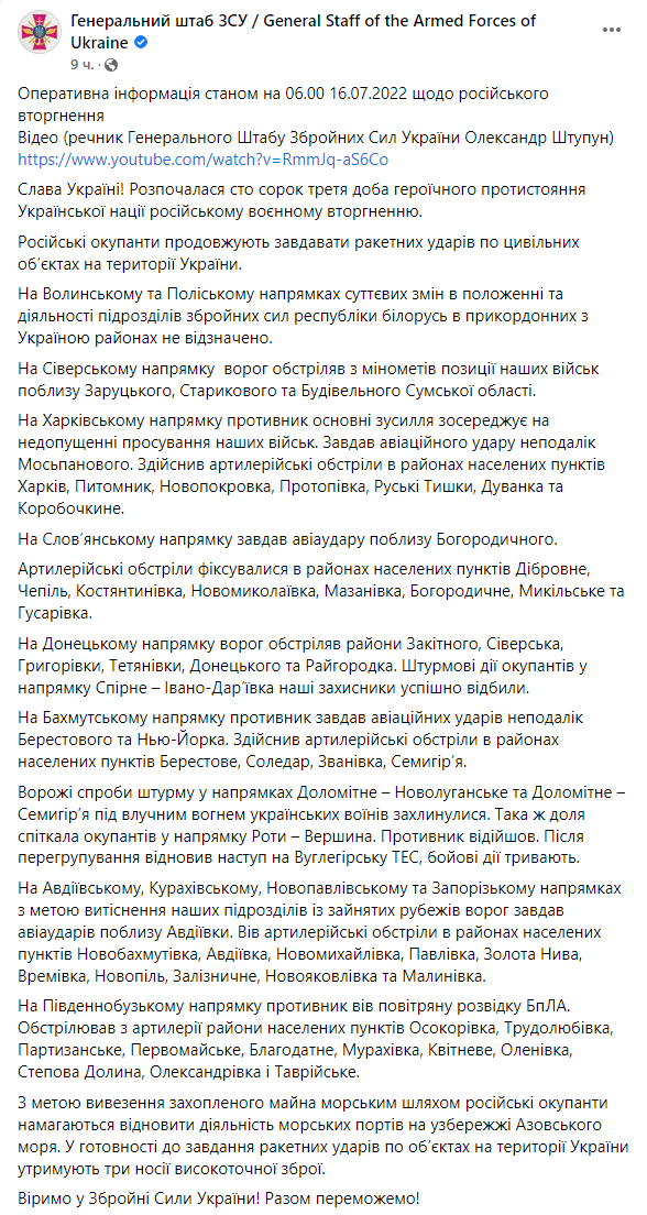 00:00. Початок 143-го дня війни, 16 липня