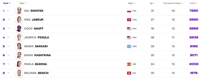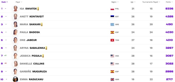 У першій десятці відбулася одна зміна – американки Джессіка Пегула та Даніель Коллінз помінялися місцями. Для Пегули сьома позиція – особистий рекорд.