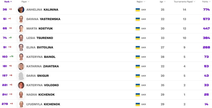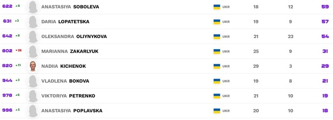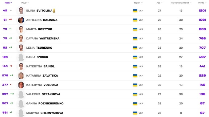 Щодо українок, то Ангеліна Калініна втратила статус першої ракетки України та вибула за межі першої півсотні. Марта Костюк, Даяна Ястремська та Леся Цуренко трохи покращили свої позиції.