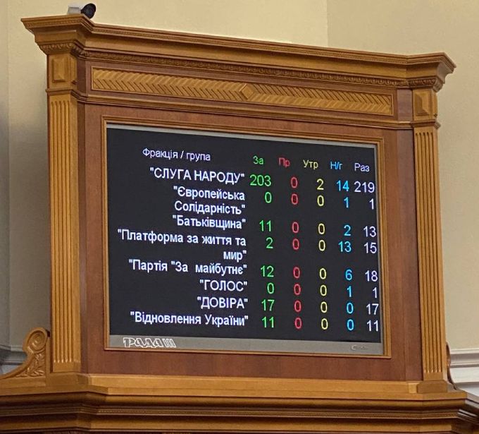 Як свідчить фото, голоси за дали 203 представники Слуги народу, 11 Батьківщини, двоє нардепів із Платформи за життя та мир (колишня ОПЗЖ), група За майбутнє – 12 осіб, 17 представників Довіри, 11 – Відновлення України та 9 позафракційних. Євросолідарність не голосувала.