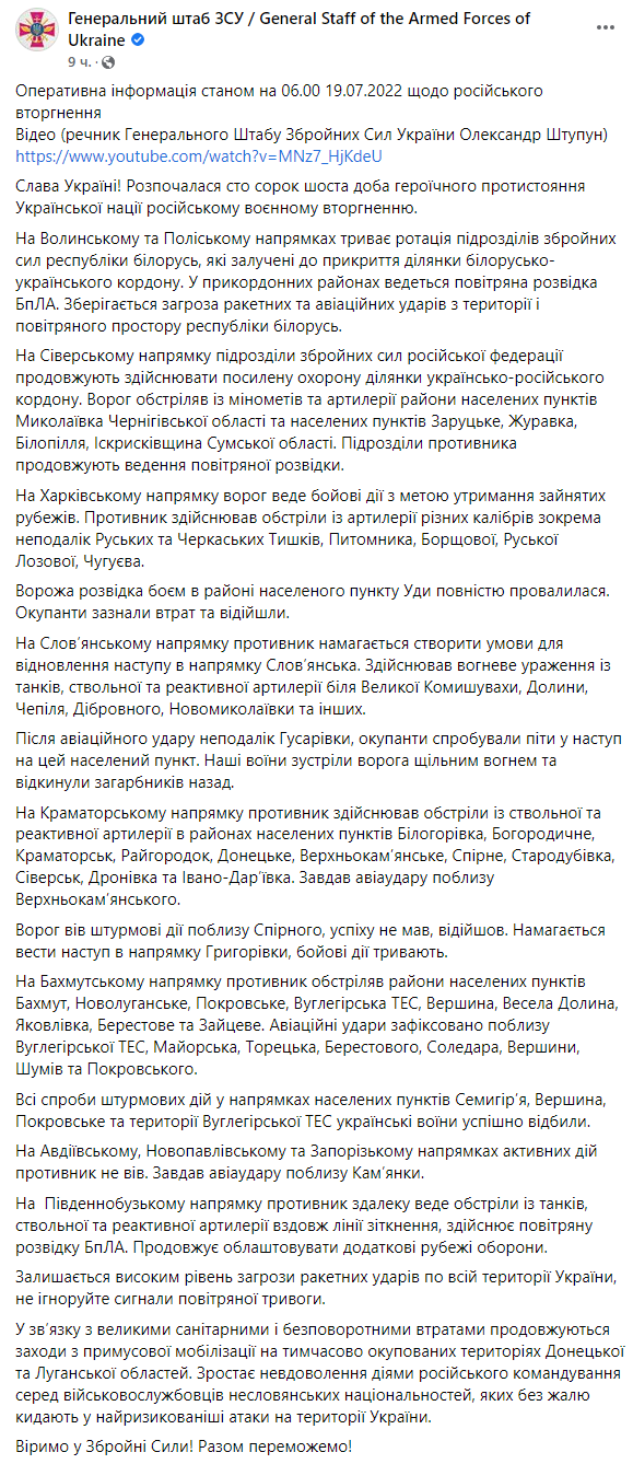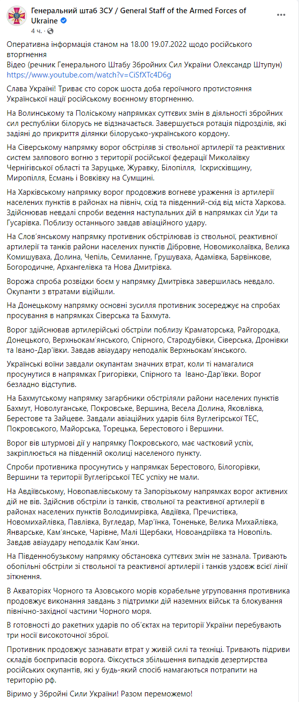 Генеральний штаб ЗСУ: Загальні бойові втрати противника з 24.02 до 19.07 орієнтовно склали: