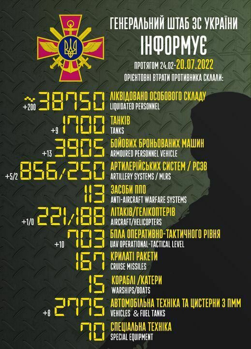 Генеральний штаб ЗСУ: Загальні бойові втрати противника з 24.02 по 20.07 орієнтовно склали: